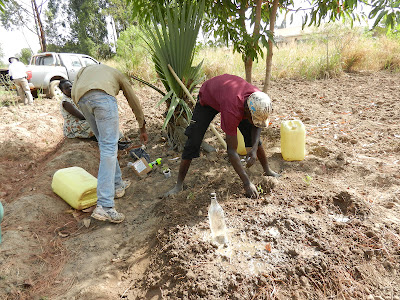 Along with the drip irrigation from Chapin, we experimented with plastic water bottles with holes punched in the sides near the bottom, allowing water to drip out into the root zone of the plant. Loosening or tightening the lids on the bottles regulates the flow of the water. |